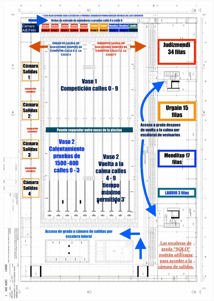 Piscina de 25 mts y 10 calles. Doble sesión de mañana y tarde, calentamiento a las 09:00 y 15:00. La entrada de los equipos a la piscina comenzará desde las 8:30 -sesión matinal- y 14:30 -sesión de tarde-