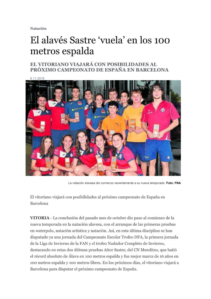A destacar en el ámbito puramente deportivo y siendo inicio de temporada las 22 mejoras de marcas personales, Mejor Marca de Álava 17 Años y Récord de Club en 100 Libre de Aitor Sastre con el tiempo de 52,10; Mejor Marca de Álava 17 Años en 100 Espalda con el registro de 55,87; Mejor marca 17 años y Récord de Club en 100 Braza con 1:07,80